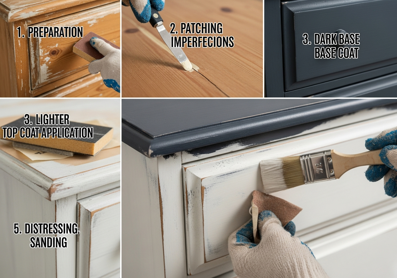 5. Technika przecierania Delikatne przecieranie krawędzi, narożników i miejsc naturalnego zużycia, aby odsłonić bazową warstwę. Papier ścierny, szpachelka (opcjonalnie)